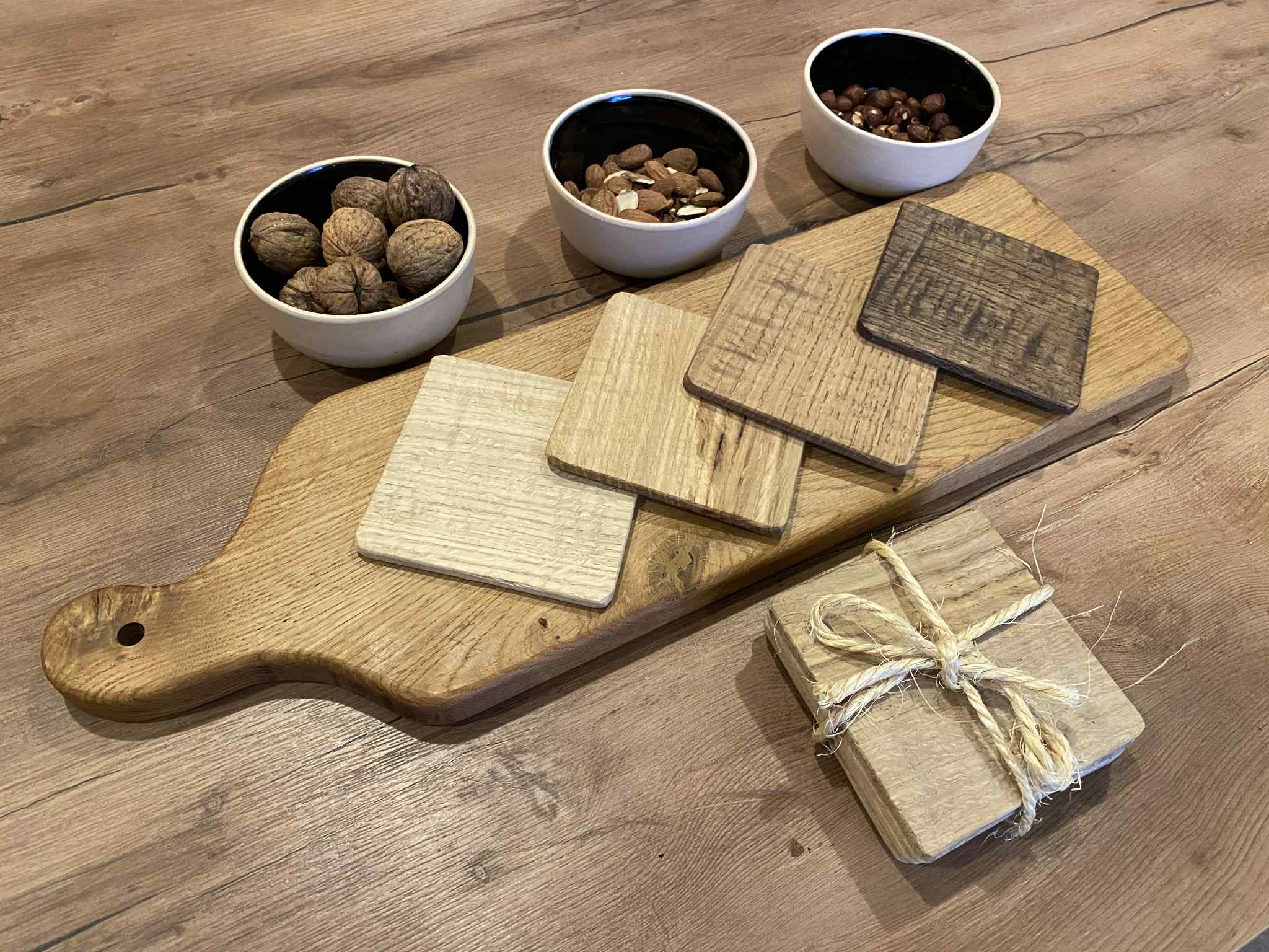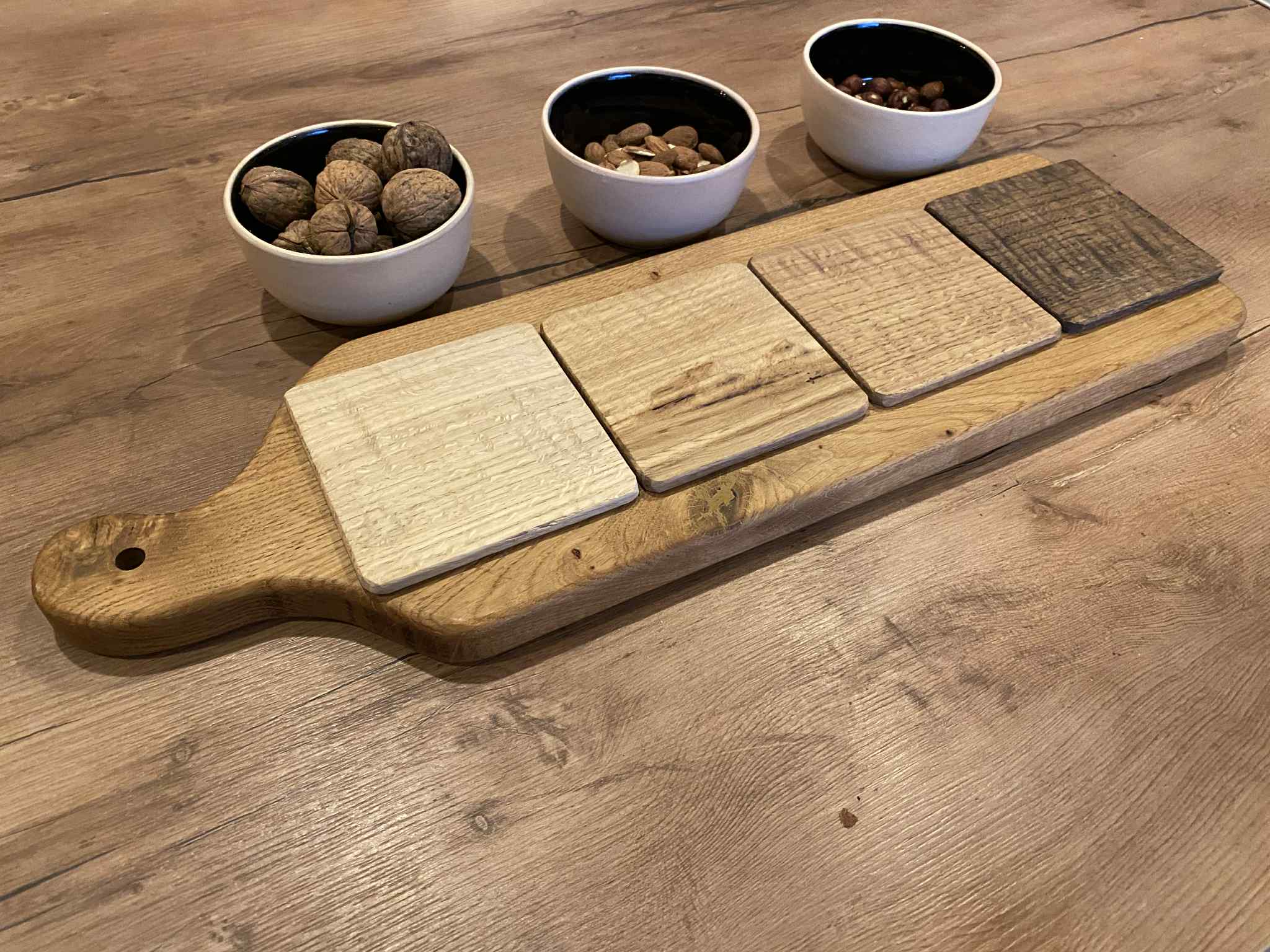 Pour accompagner ces dessous de verre, je fabrique également des planches apéro / planches à découper assorties, dans les mêmes essences et finitions.