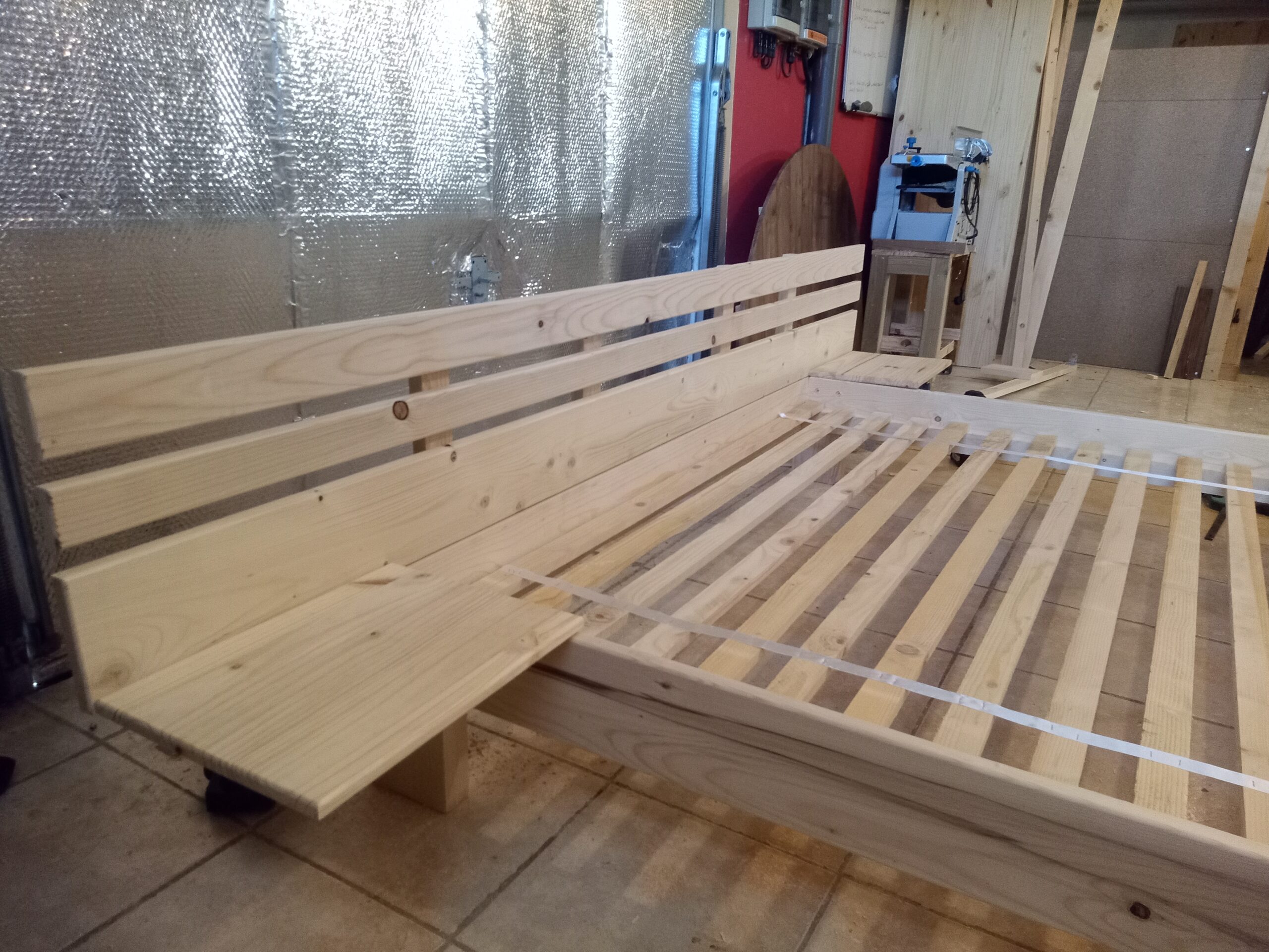 . Possibilité d’élargir la tête de lit et d’ajouter des tablettes en pin (voir photo) (épaisseur 18 mm) (supplément de 60 euros, me contacter).